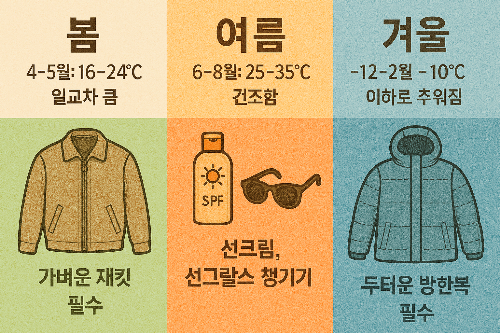 - 여름(6~8월): 25~35°C, 건조함 → 선크림, 선글라스 챙기기